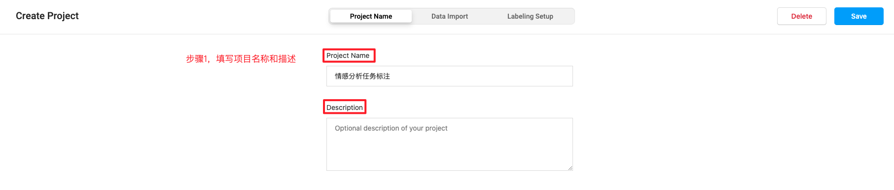 创建项目之前,需要先确定标注的任务类型以及需要标注哪些内容,然后点击创建(Create)开始创建一个新的项目,填写项目名称、描述。