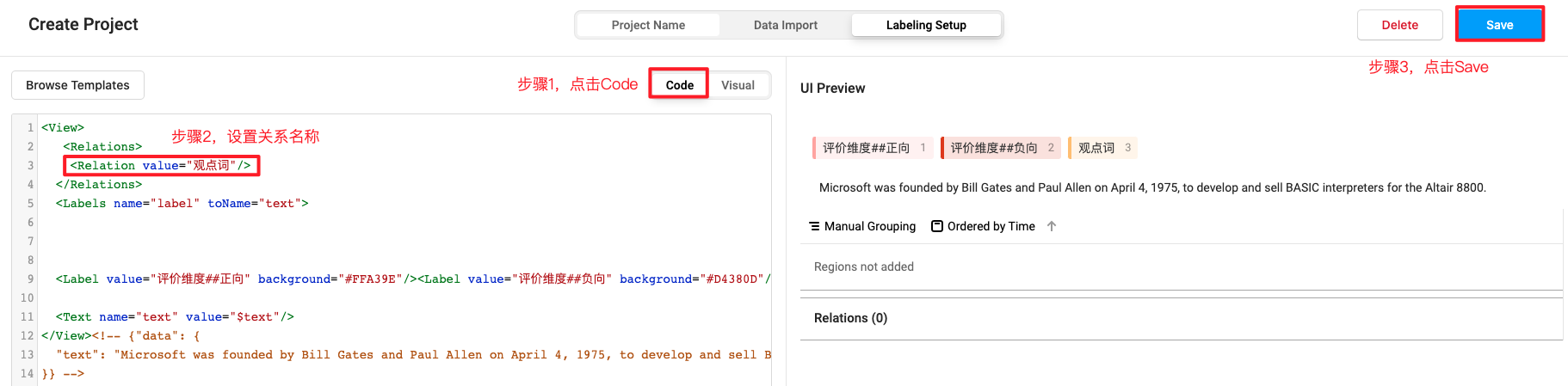 这里只涉及到1中Relation类型标签,即评价维度到观点词的映射关系。这里可以设置一下两者关系的名称,即点击Code,然后配置关系名称(这里将两者关系设置为观点词),最后点击保存即可。