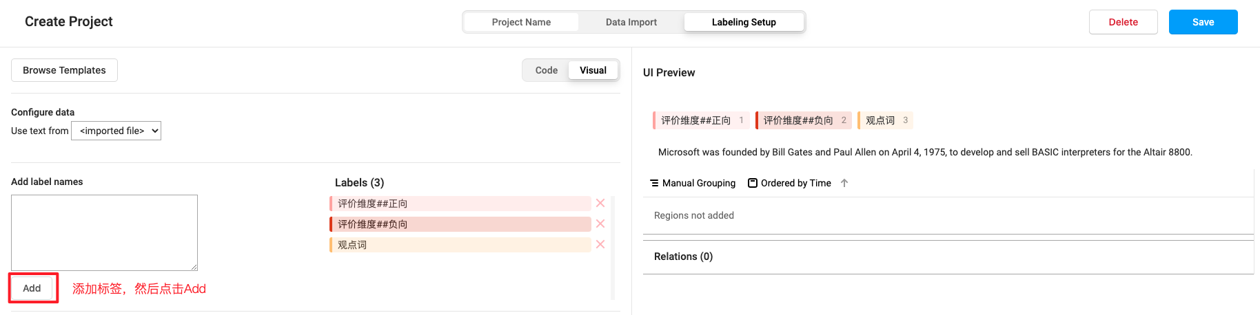 在设置好Span类型和Relation标签之后,便可以开始进行标注数据了。