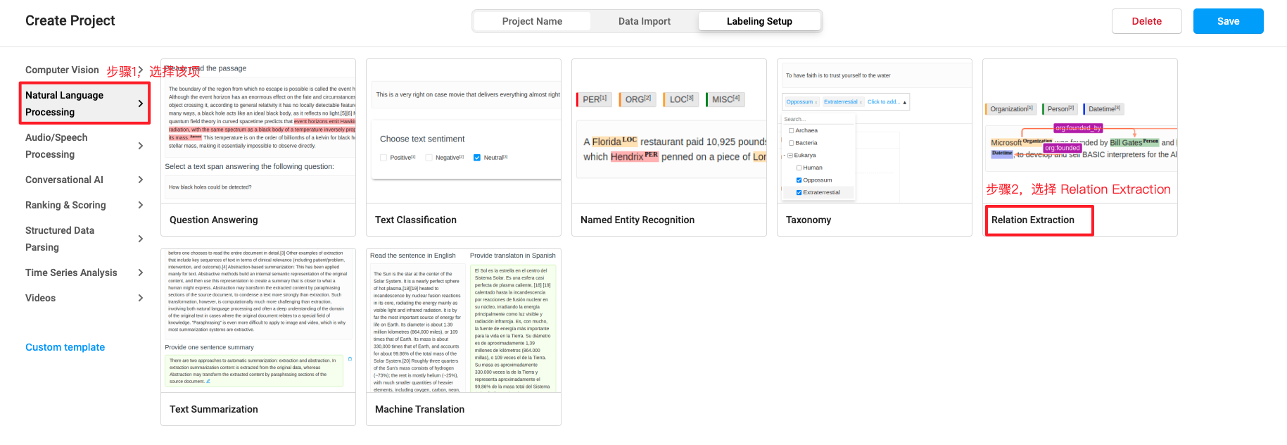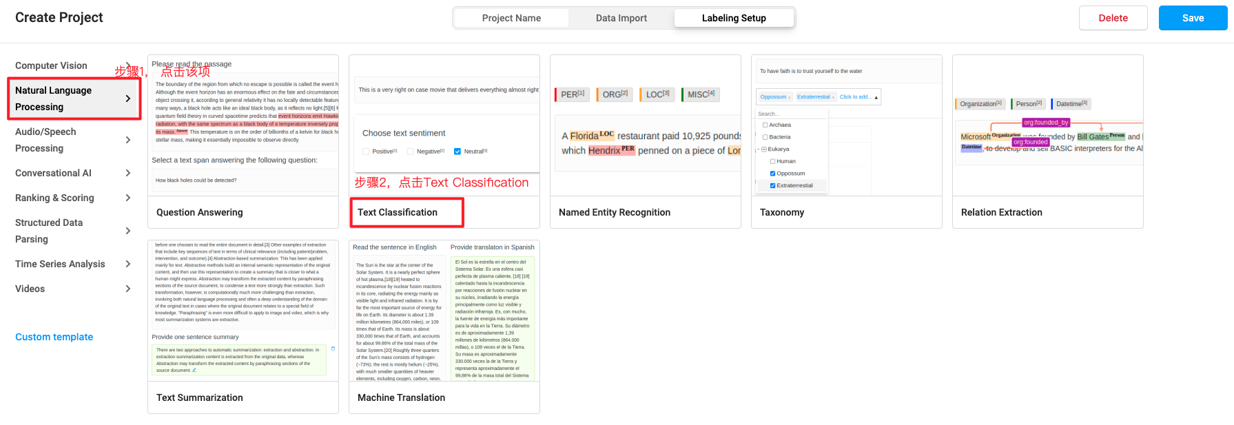 接下来,根据需要标注的任务类型,选择适合的任务。在本项目中,默认会包含两种类型的任务:语句级情感分类任务和属性级情感分析任务。由于这两者都属于自然语言处理(NLP)任务,因此可以点击 Natural Language Processing 选项,在该选项下面进行选择相应的子项任务。