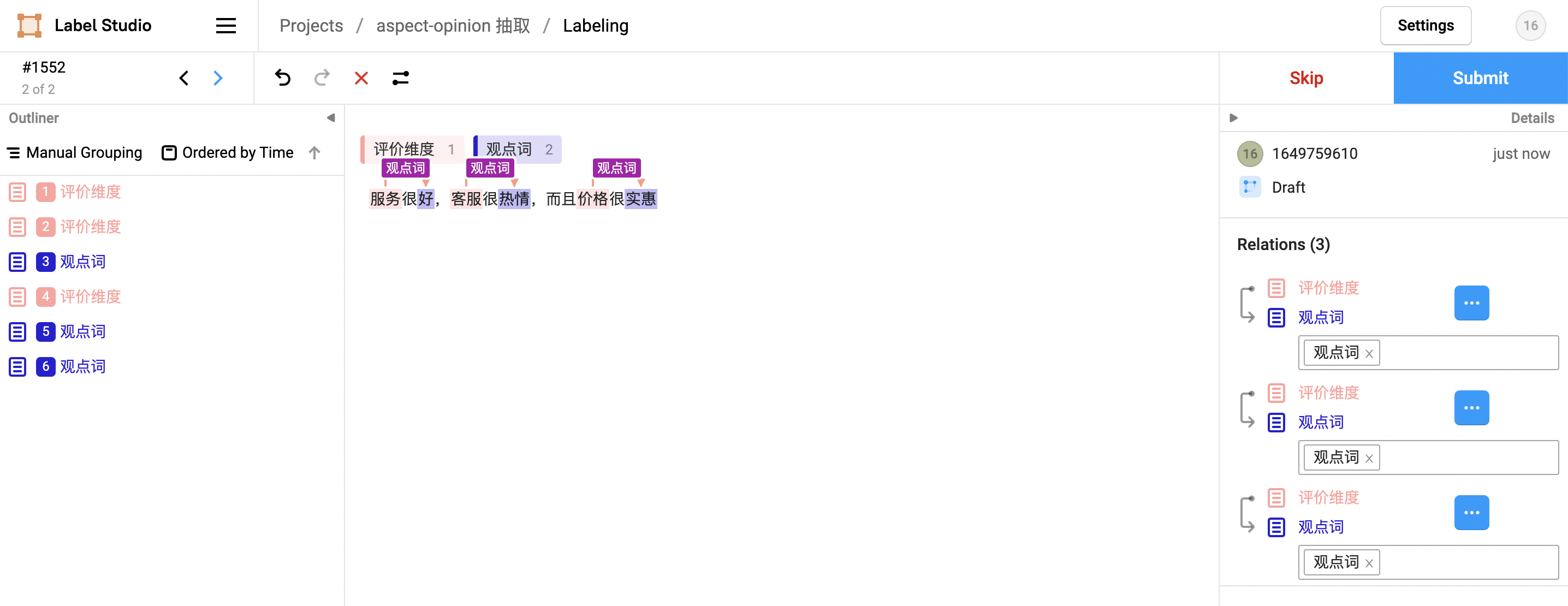 在本项目中,属性级的情感分析需要配置的标注任务类型为Relation Extraction,包括属性抽取、观点抽取、属性-观点抽取、属性-情感极性抽取、属性-情感极性-观点词三元组抽取等任务。其中属性-情感极-观点词(A-S-O)三元组抽取是最常见的任务之一,下面优先讲解该任务的标注规则。