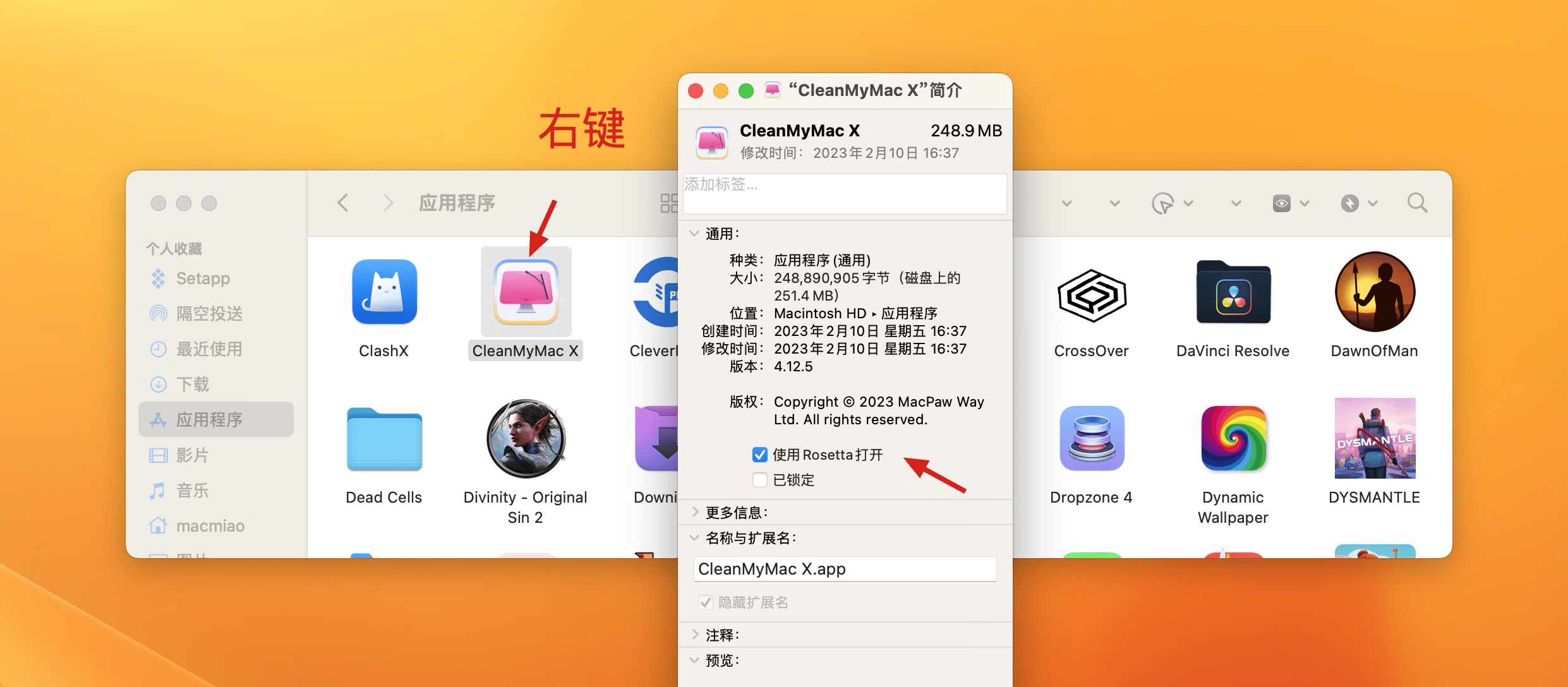 1.应用程序右键–显示简介–勾选Rosetta。如图(intel的电脑跳过这步)