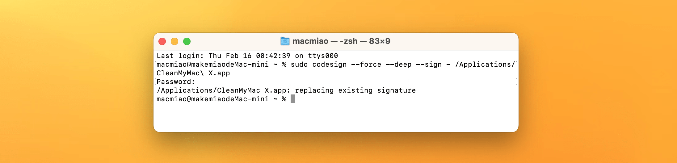 sudo codesign --force --deep --sign - /Applications/CleanMyMac X.app