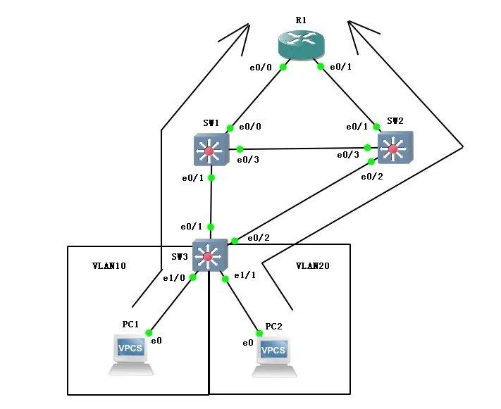 通过设置MSTP,使PC-1走SW3 -> SW1 -> R1的道路,PC-2走SW3 -> SW2 -> R1的道路,实现负载均衡,合理分配网络流量。