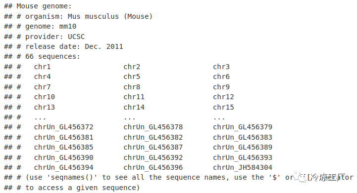 首先,我们需要为我们正在处理的基因组加载 BSgenome 对象,UCSC 为小鼠基因组构建的 mm10,BSgenome.Mmusculus.UCSC.mm10。
