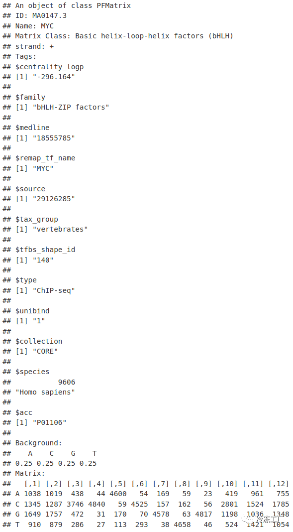 pfm <- getMatrixByName(JASPAR2020, name = "MYC")