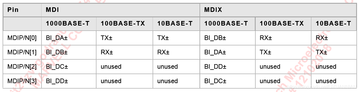 下表为不同的以太网标准下PHY接口定义和RJ45的引脚对应关系(MDIX配置)。