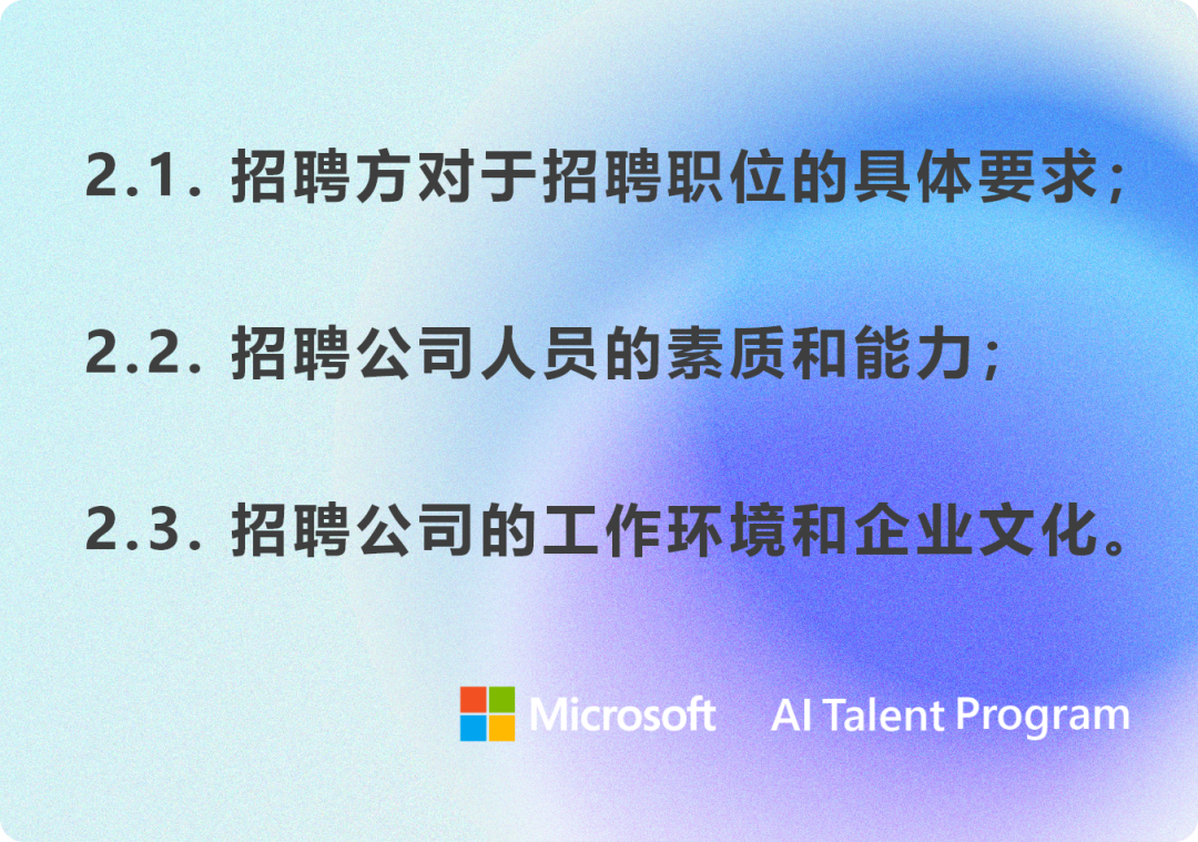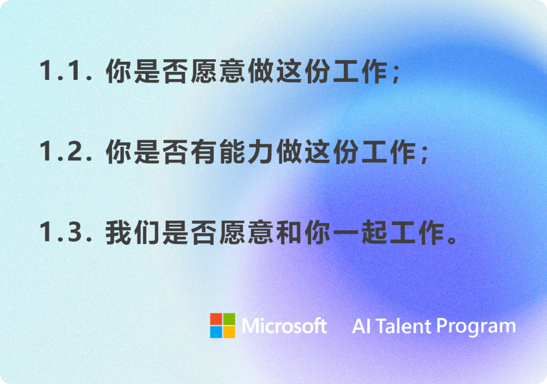 2.1 和1.1相对应,面试的过程,是双方相互了解的过程。如果发现职位所要作的事情和自己的期望完全不相符,那么说明应聘者本身对于自己是有明确定位和特定感兴趣领域的,公司如果不能支持应聘者的个人规划,恐怕只好放弃了。