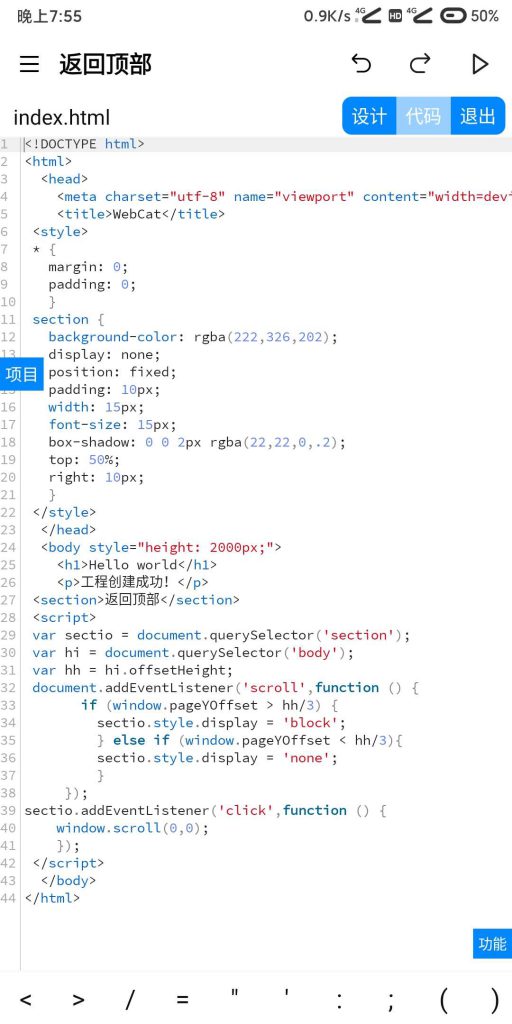 首先我们的页面需要一个返回顶部的按钮,用户用来点击(必须使用固定定位定位不然它就跟页面走了,然后在css中让它的display: none;)。