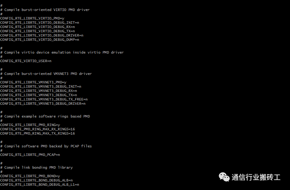 CONFIG_RTE_LIBRTE_VMXNET3_PMD=y配置文件中相关的宏定义,y标识为使能,n标识为去使能,来决定相关特性的编译情况。
