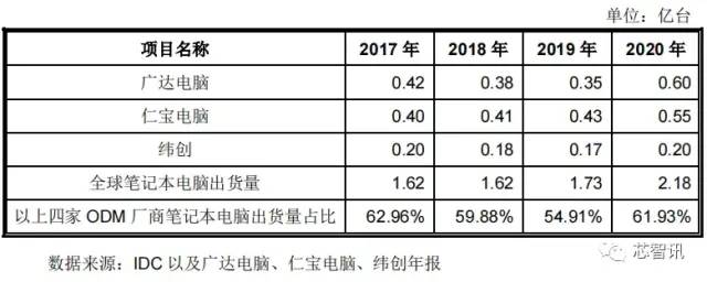 根据 IDC 以及广达电脑、仁宝电脑、纬创年报数据统计,2017-2020 年广达电脑、仁宝电脑、纬创三家 ODM 厂商笔记本电脑出货量占全球笔记本电脑市场的比重分别为 62.96%、59.88%、54.91%和 61.93%,总体呈现下降趋势。需要指出的是,在IDC的统计当中,有部分白牌笔记本的出货并未被统计当中。