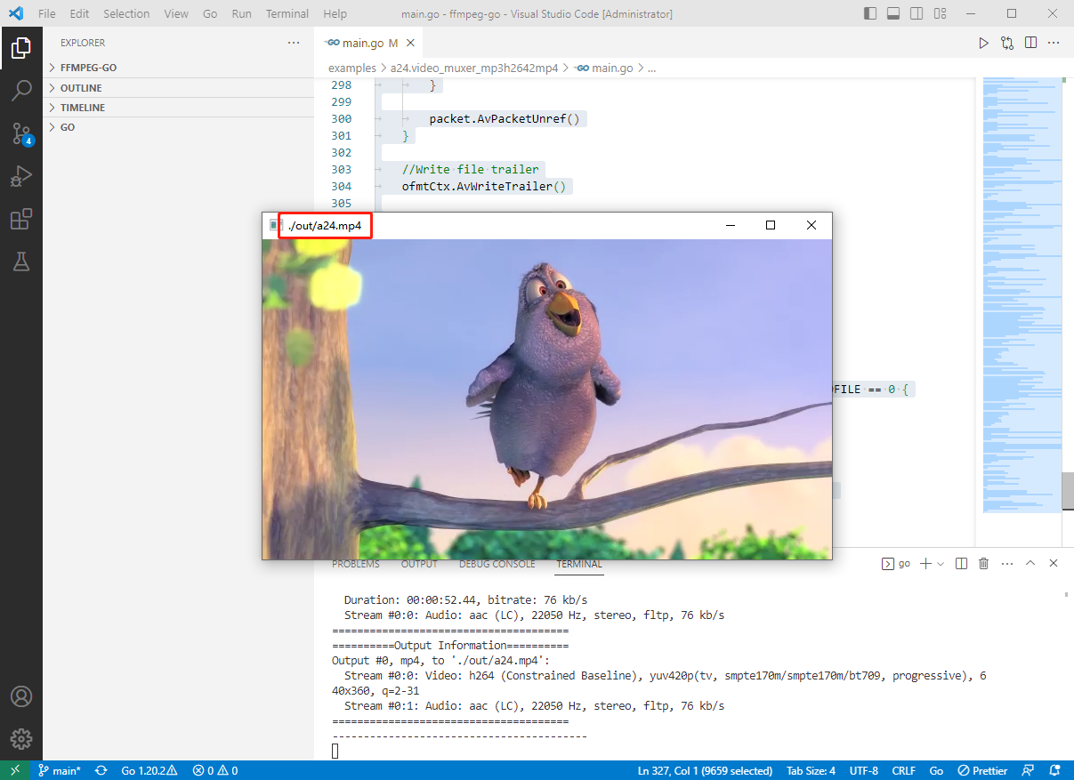 go run ./examples/a24.video_muxer_mp3h2642mp4/main.go代码参考24:音视频mp3和h264混合(muxer)编码为mp4,代码如下: