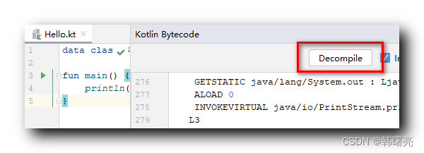 在 Kotlin Bytecode 界面 中 , 选择 Decompile 选项 , 将 字节码数据 反编译为 Java 代码数据 ,