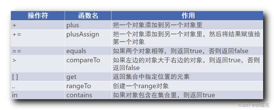 }下图是 Kotlin 运算符重载操作符对应的函数名 :