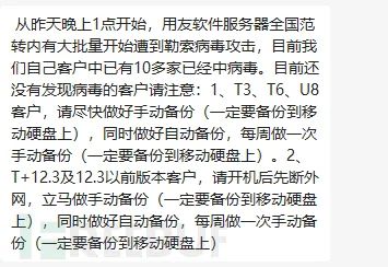 8月29日,国内知名技术社区qidao123.com消息,我国多个安全技术社群开启疯狂吐槽模式,网传以用友为代表的头部管理软件厂商遭遇大规模勒索攻击,从而影响到无数下游企业,引发了难以想象的危害,其损失暂时无法估计。