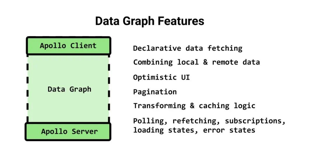 数据图在连接的两端均有 Apollo 服务器和客户端,它可以简化获取逻辑、错误逻辑、重试逻辑、分页、缓存、optimistic UI 以及其他各种类型的样板数据管道代码。