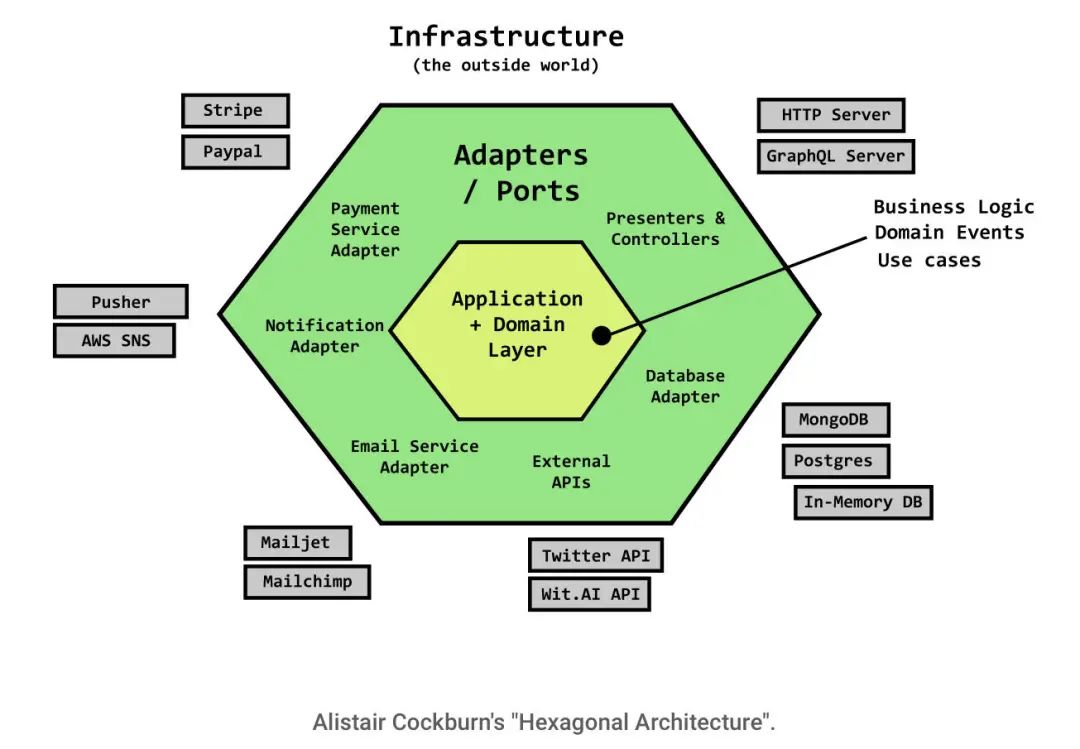Alistair Cockburn 在“六边形架构”中提到,我们架构的最内层是应用程序和域层。在这一层的外面是适配器(或端口)。