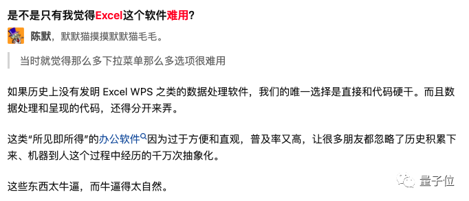 他认为,如果没有Excel等软件,数据统计及处理工作需要所有人敲代码完成。正是由于「所见即所得」的办公图表软件,今天我们才能更高效做数据统计及处理工作。
