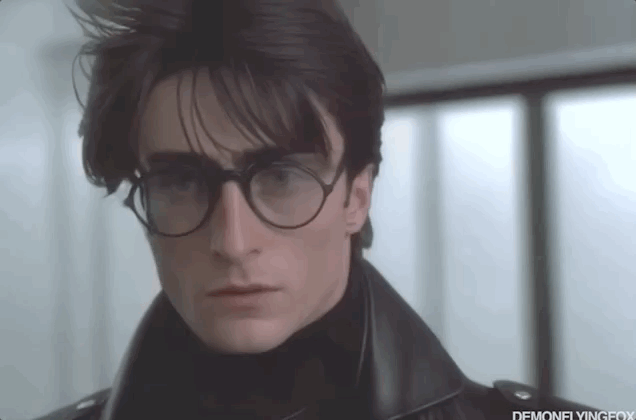 1990 screengrab of male model Harry Potter wearing oversized black leather jacket with bold shoulder pads, slim-fit jeans, and a simple white t-shirt, fashion movie scene, Balenciaga commercial —ar 3:2 —v 5 —q 2