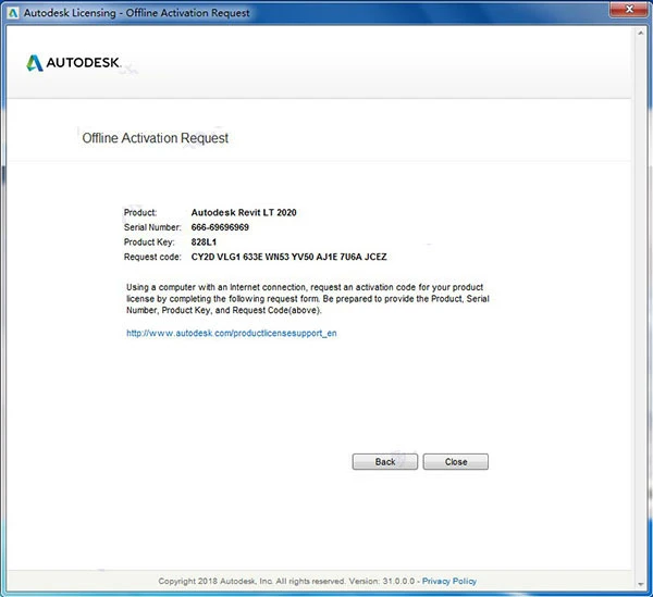 11、获取产品信息,用户复制【request code】一栏下的的机器码,然后点击【close】关闭。
