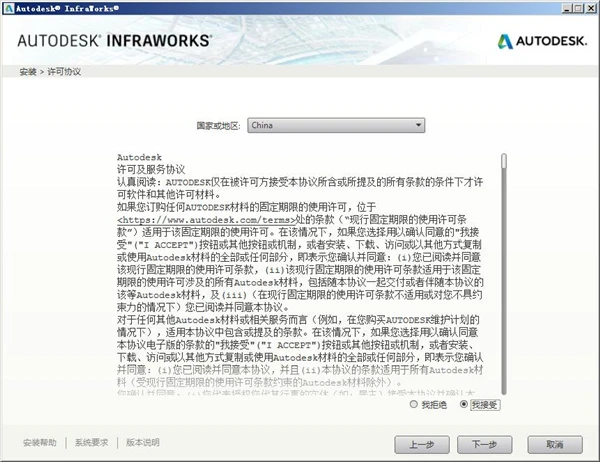 3、阅读Autodesk Infraworks 2020软件的许可协议,勾选【我接受】,再点击【下一步】按钮。