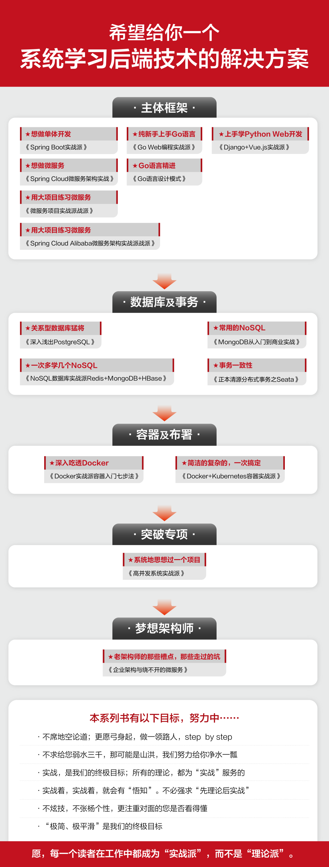 - 一步步引导来让读者理解并实现复杂的微服务系统。