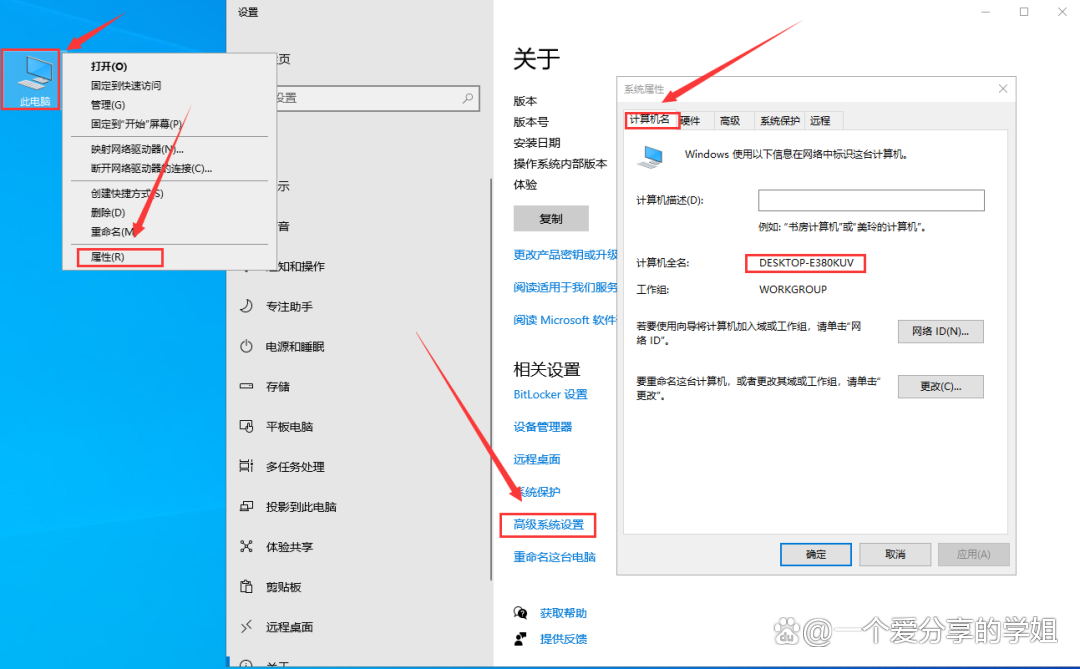 附“计算机全名”查看方法:鼠标右击桌面【此电脑】选择【属性】,点击【高级系统设置】,点击【计算机名】(全选计算机全名可复制)。