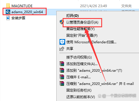 ☉17.打开安装包解压后的【Adams2020(64bit)】文件夹,鼠标右击【adams_2020_win64】选择【以管理员身份运行】。