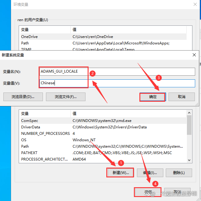 ☉32.在系统变量中,点击【新建】,输入变量名【ADAMS_GUI_LOCALE】,输入变量值【Chinese】,点击【确定】,点击【确定】。