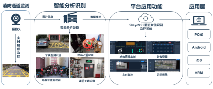 消防通道占用报警及受理:当消防通道监测出堵塞、占用等异常情况,自动产生报警信号并上传到SkeyeVSS系统,监控中心提供24小时报警受理服务,第一时间通过电话、短信或手机App通知相关责任人员响应和处理。