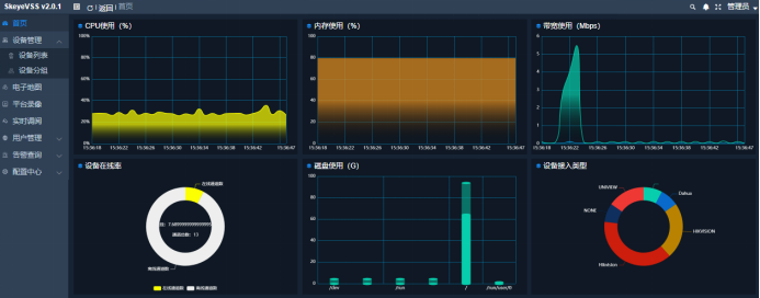 可视化、数据化展示分析:SkeyeVSS系统平台界面展现设备接入状况、设备运行、宽带使用、存储空间等状态监测,直观展示智能识别的车、物、事件等违规行为和结果,并运用大数据分析技术,实现消防分析图表的直观展示、消防火灾故障的本质挖掘和消防态势的准确研判。