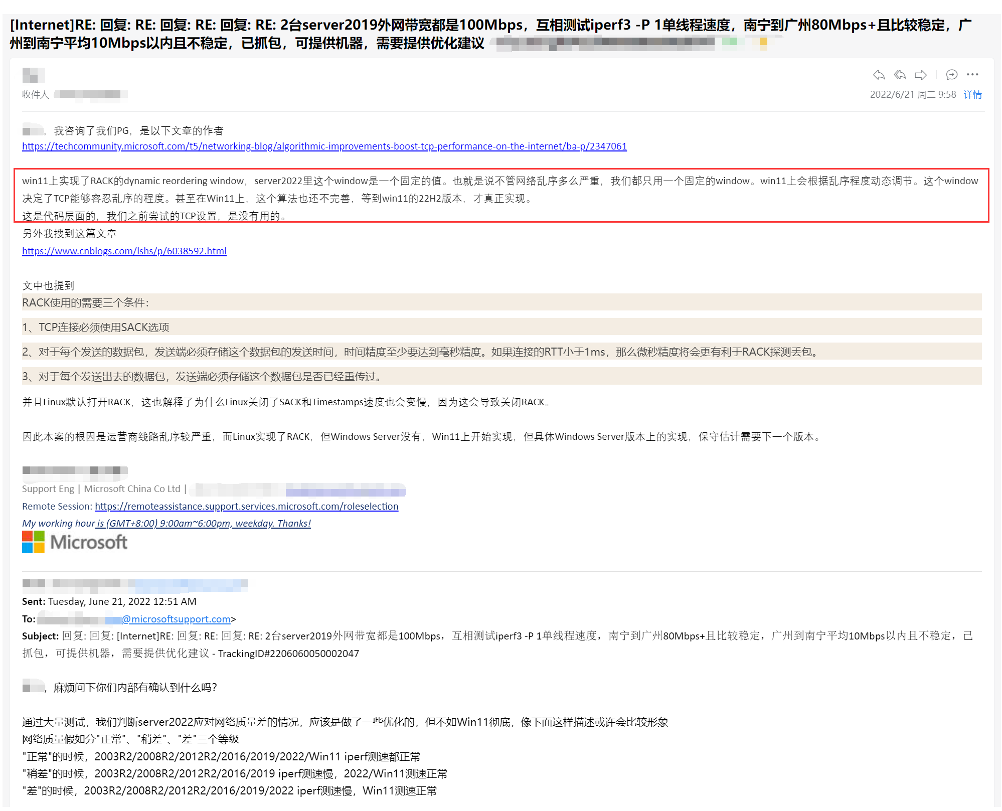 之前遇到一个场景,公网传输速度上不去,抓包发现乱序重传非常多,同样的机器、网络,啥都不变,换成部分linux系统正常了,部分linux系统不行,所有windows系统除过win11内核的都试了一遍都不行,换成win11内核的系统可以了,就此咨询了微软,答复如下:
