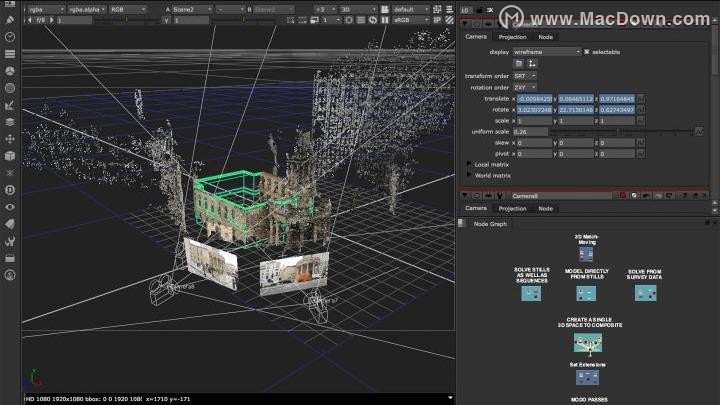 -3D工作区 Nuke提供无限的集成3D环境,可让您创建和渲染由2D素材,3D模型,卡片,基本几何体,相机,灯光和网格组成的复杂场景。非常适合用于设置替换的摄像机投影以及需要模拟“真实”环境的其他任务。