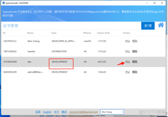 类型:下拉选择发布证书 证书名称:不要中文、不要太长了、随意设置 邮箱:随意 密码:证书的密码、比如设置123这样,不用很复杂,记好、打包时要用、很重要 应用id:这里不用选 3. 创建成功后,找到刚创建的发布证书(iOS Distribution这个类型的就是发布证书,如果之前创建过看过期时间或者ID就知道哪个是新创建的了)! 点击p12 文件,下载保存.p12证书文件到电脑。