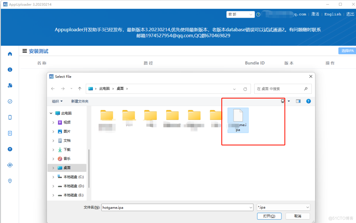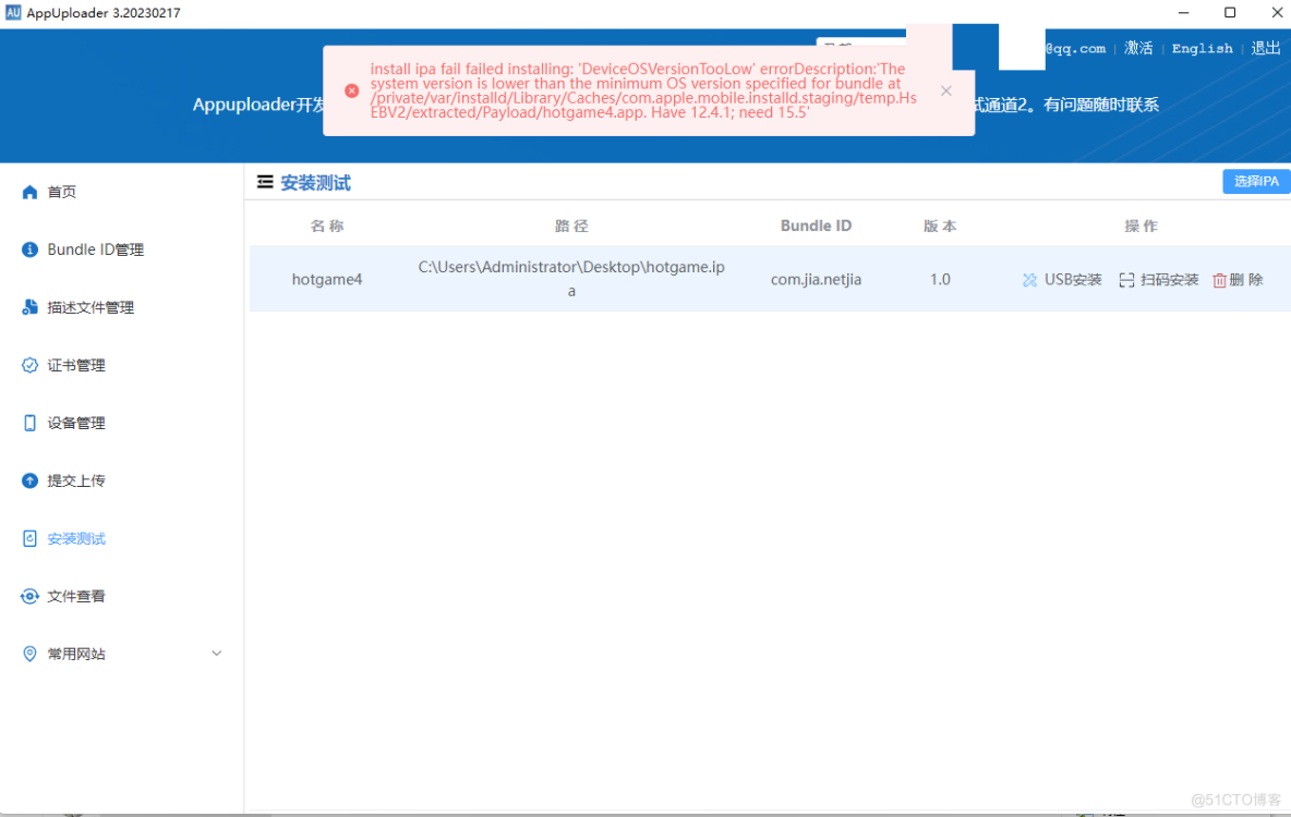 进入“安装测试”页面,选择一个(必须是开发类型描述文件编译,且描述文件包含设备的UDID)的IPA文件上传。