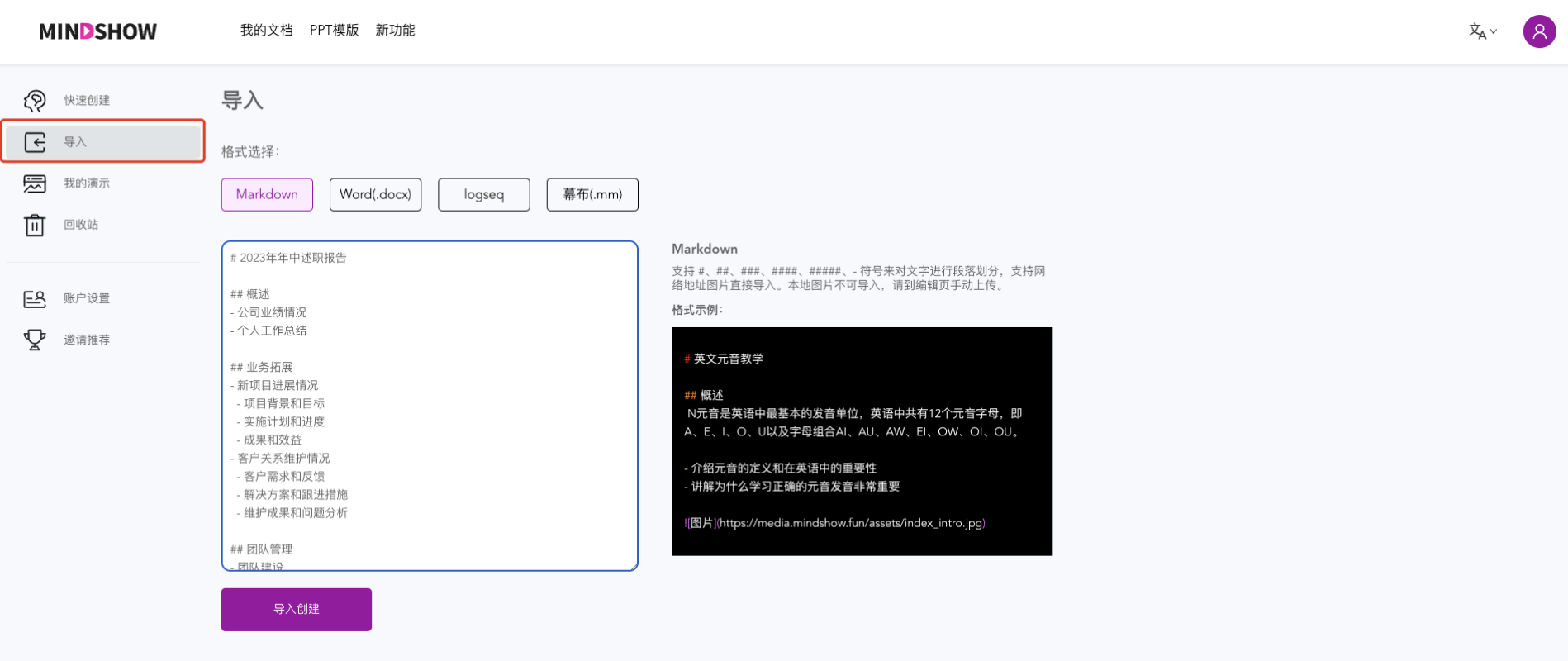 然后,点击左边菜单的【导入】,将chatgpt生成的markdown语法内容,复制到格式为【Markdown】的文本框里,然后选择【导入创建】——