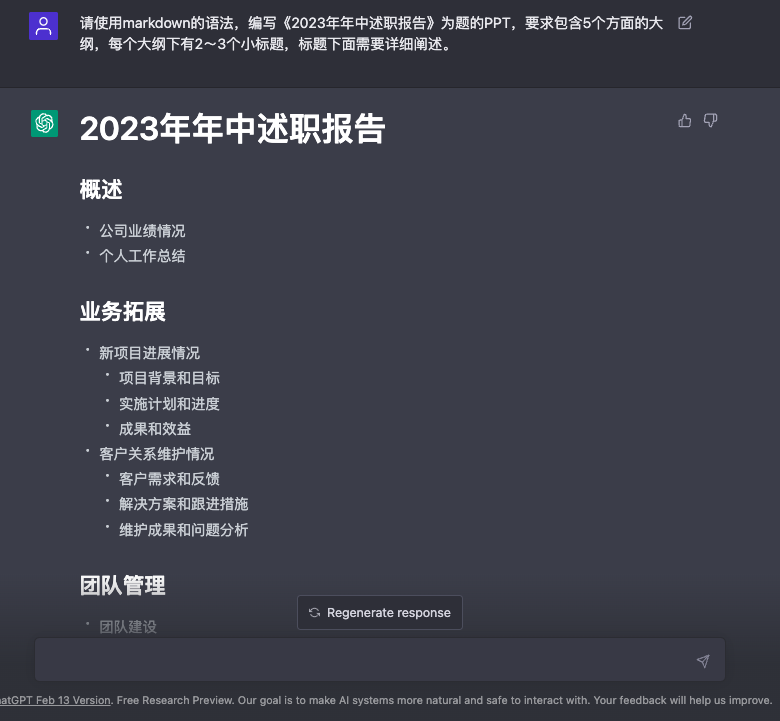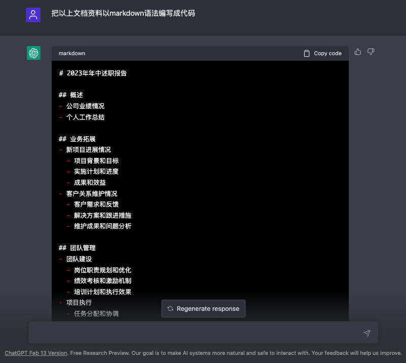 一、首先,通过chatGPT说明你的需求,学会提问是Ai时代最关键的一步。你需要提供一些关键信息,如果没有关键信息,就按照大纲方式让它设计,例如,我让它帮我写一份《2023年年中述职报告》的模版——