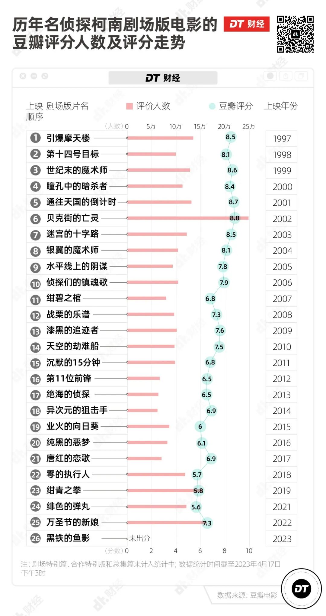 据DT财经在豆瓣电影上的统计,柯南剧场版的豆瓣评分一直不太稳定,自2004年后就再也没有攀上8分。即使被评为“近十年最佳”的《万圣节的新娘》,也有高赞评论称“大概对柯南来说,不难看就约等于好看了”。