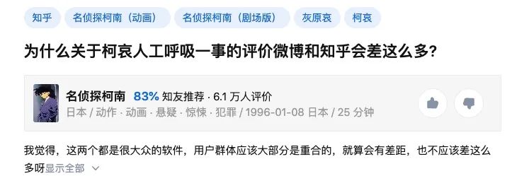 而在知乎,更多是原著党通过作品细节分析柯哀党为什么会兴起,以及这是否是一次恶意营销。