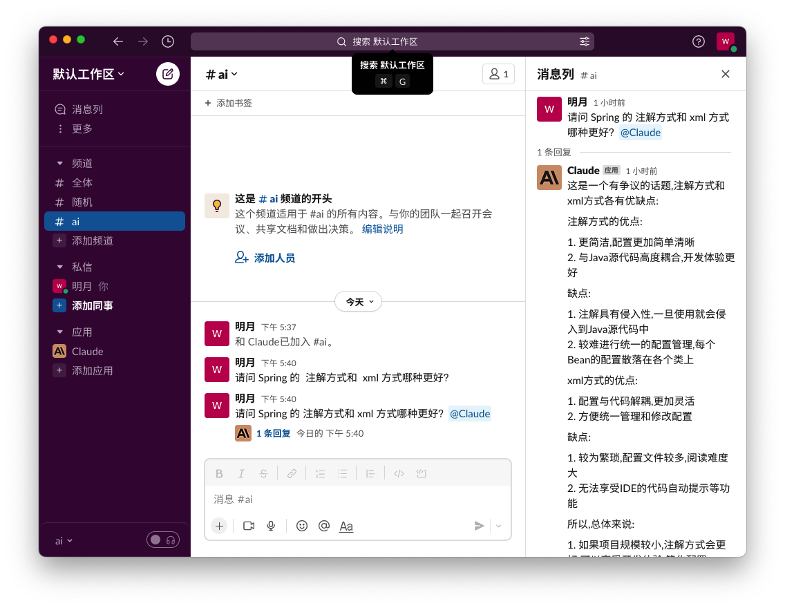 (2)创建频道,在频道中提问后 @Claude 即可。