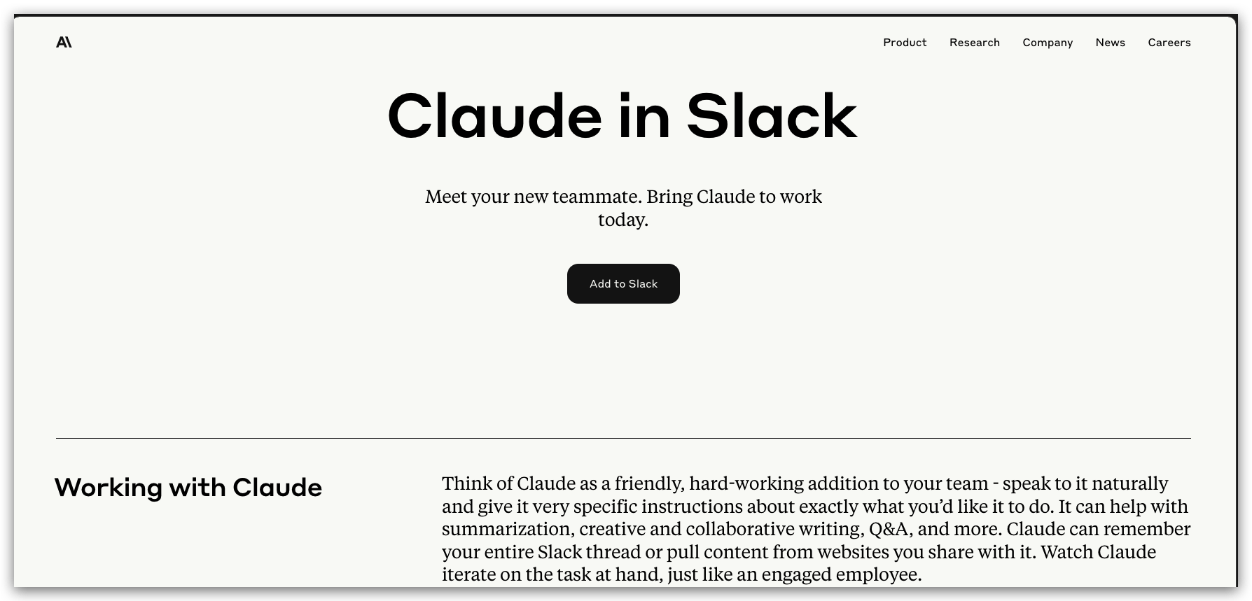 Think of Claude as a friendly, hard-working addition to your team - speak to it naturally and give it very specific instructions about exactly what you’d like it to do. It can help with summarization, creative and collaborative writing, Q&A, and more. Claude can remember your entire Slack thread or pull content from websites you share with it. Watch Claude iterate on the task at hand, just like an engaged employee.