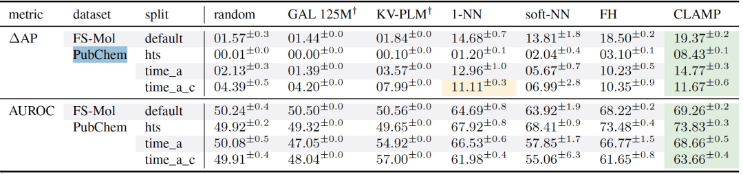 零样本迁移学习:作者在FS-Mol和PubChem这里两个数据集上对CLAMP的能力与其他方法做了对比。可以看到,基于纯自然语言的模型GAL和KV-PLM并不能很好的做好零样本下的迁移学习。值得注意的是,FH是目前最好的方法,CLAMP仍能够在各种数据集划分的方式下打败它。