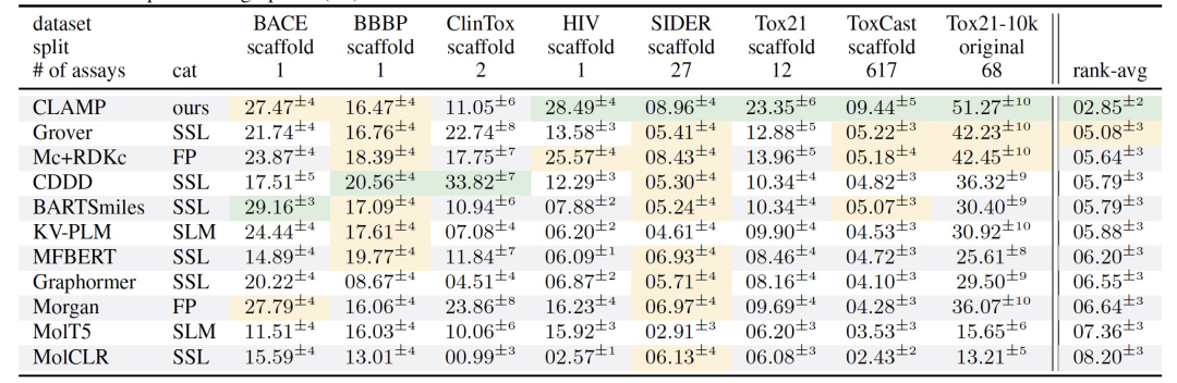 模型表示能力:为了检查模型学习到的分子表示是否可转移到其他任务上,文章选取MoleculeNet作为基准数据集,将CLAMP与其他方法进行对比。通过在分子表示层特征进行线性调整之后,CLAMP效果甚佳,在大部分情况远超已有模型。
