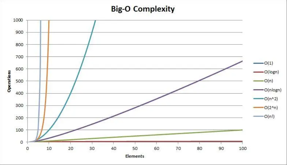 时间复杂度或空间复杂度随元素数量N增加变化的曲线图
