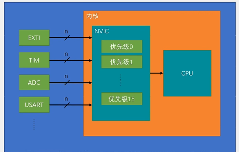图3 NVIC结构图 由于CPU是主要用来运算的,故把中断分配的任务外包给了NVIC,他有很多个输入口,可以接很多的中断口。