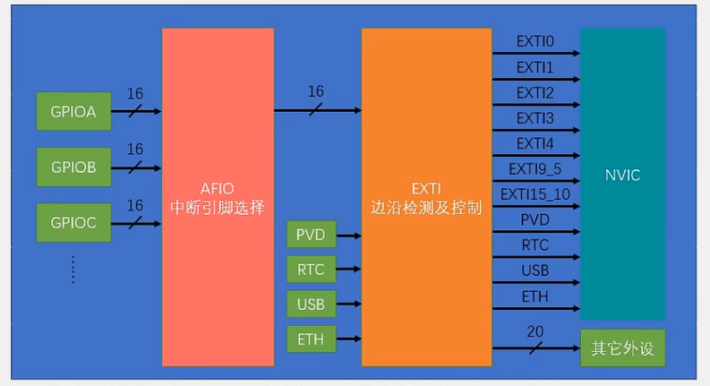 在上图中AFIO、EXTI、NVIC都有其特定的作用: