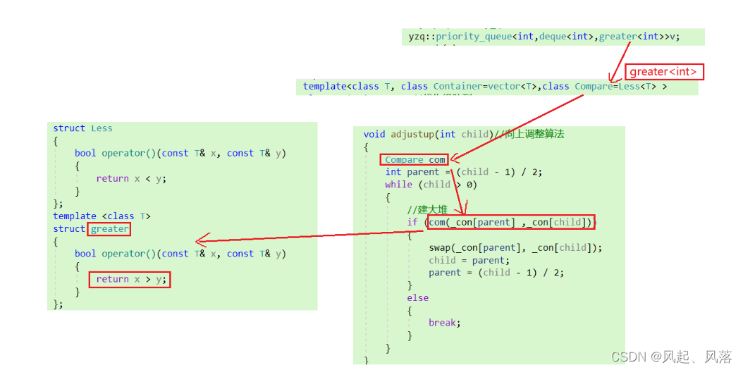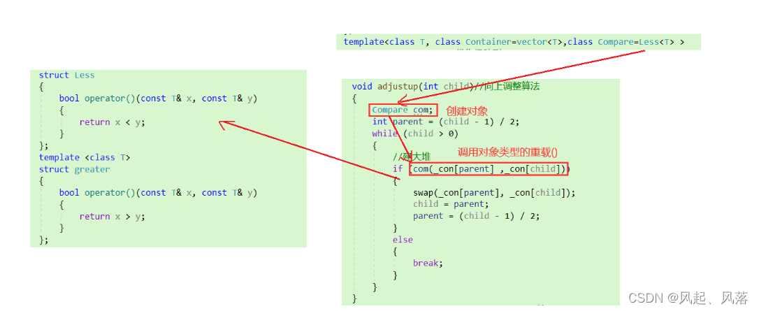 通过该类型在向上/向下调整算法中分别建立对象,通过对象调用对应类less/greater的重载()从而达到目的