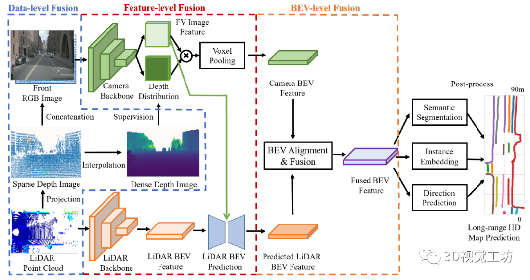 最后,融合后的BEV特征可以支持不同的头部,包括语义分割、实例嵌入和方向预测,进行后处理生成高清地图预测。