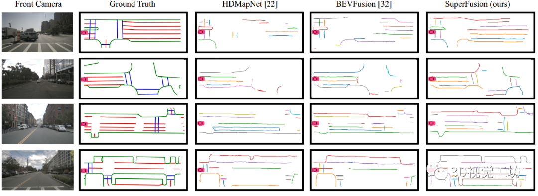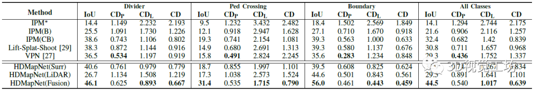 需要特别注意的是,HDMapNet并不一定需要做多传感器融合,纯相机或者纯雷达也是可以基于HDMapNet构建HD地图,只是效果相对要弱一些。HDMapNet的结果显示,相机对于车道线、人行横道线这种视觉纹理丰富的特征识别的较好,雷达对于路沿这种物理边界的效果更好。