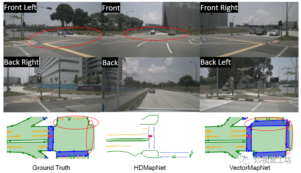不仅如此,VectorMapNet更强大的地方在于,它甚至可以检测出来未标注的车道线!从下图可以看出,在原始的数据集中漏标了一条车道线,HDMapNet无法检测出来,但VectorMapNet却输出了这一结果。